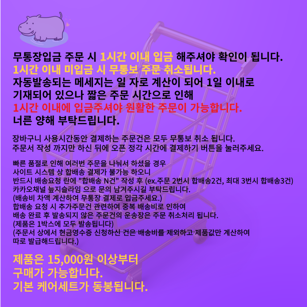 주문 후 1시간 이내 미입금시 무통보 취소 됩니다.